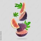 Fresh sweet figs and green leaves falling against light grey background