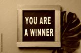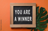Chalkboard with phrase You Are A Winner and green monstera leaf on dark orange background, top view