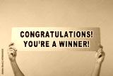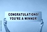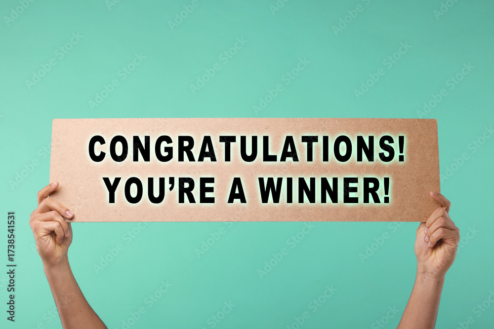 Man holding sign with phrase Congratulations! You're A Winner! against turquoise background, closeup