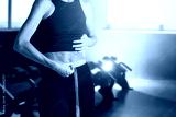 Athletic woman with flat belly and measuring tape in gym, closeup