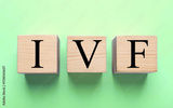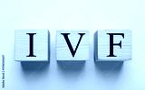 In vitro fertilization. Wooden cubes with abbreviation IVF on light green background, top view. Banner design