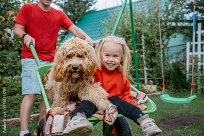 Little girl child laughs with her curly brown dog poodle on a garden wheelbarrow in summer, happy childhood