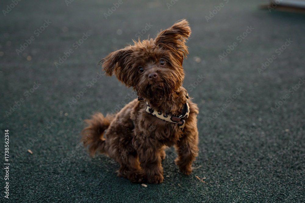 Brown dog puppy Yorkipoo Maltipoo outside, close up