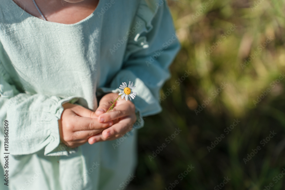 A child girl holds a daisy in her hands in summer