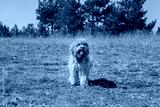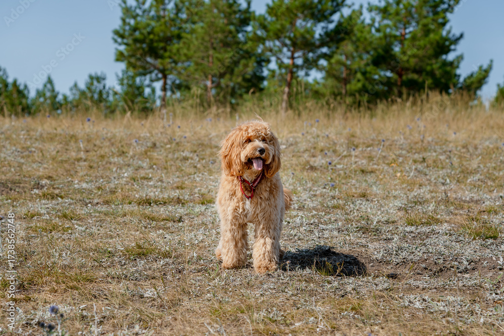 Adorable curly brown dog of the breed Labradoodle or Kawapu walks on a hill in the mountains