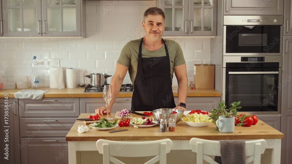 Mid adult man preparing for cooking in modern kitchen at home, wearing casual cloth and apron. Male chef following food recipe, cleaning and slicing vegetables.