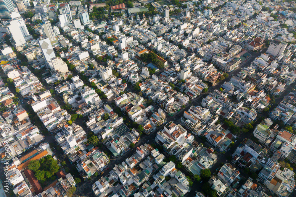 Diagonal view high angle shows densely populated residential and commercial buildings with colorful roofs situated along a grid of streets