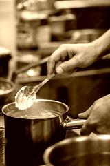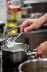 Close-up of a person cooking in a kitchen, holding a spoon with white food over a saucepan on a stovetop. Culinary preparation in a busy home or professional kitchen