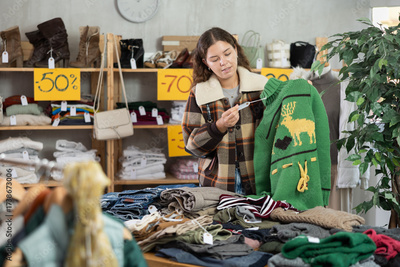 Selective young woman choosing winter jersey in clothing shop with large assortment