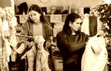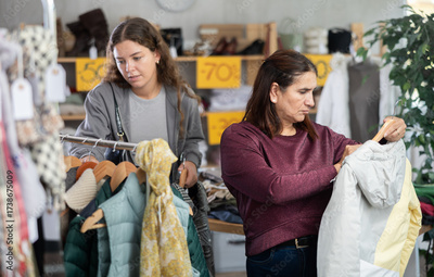 Fashionista latin woman near showcase examine goods, buying down coat. Style and fashion type look, modern trends. Other buyer browsing clothes goods in background, crowded shop