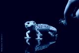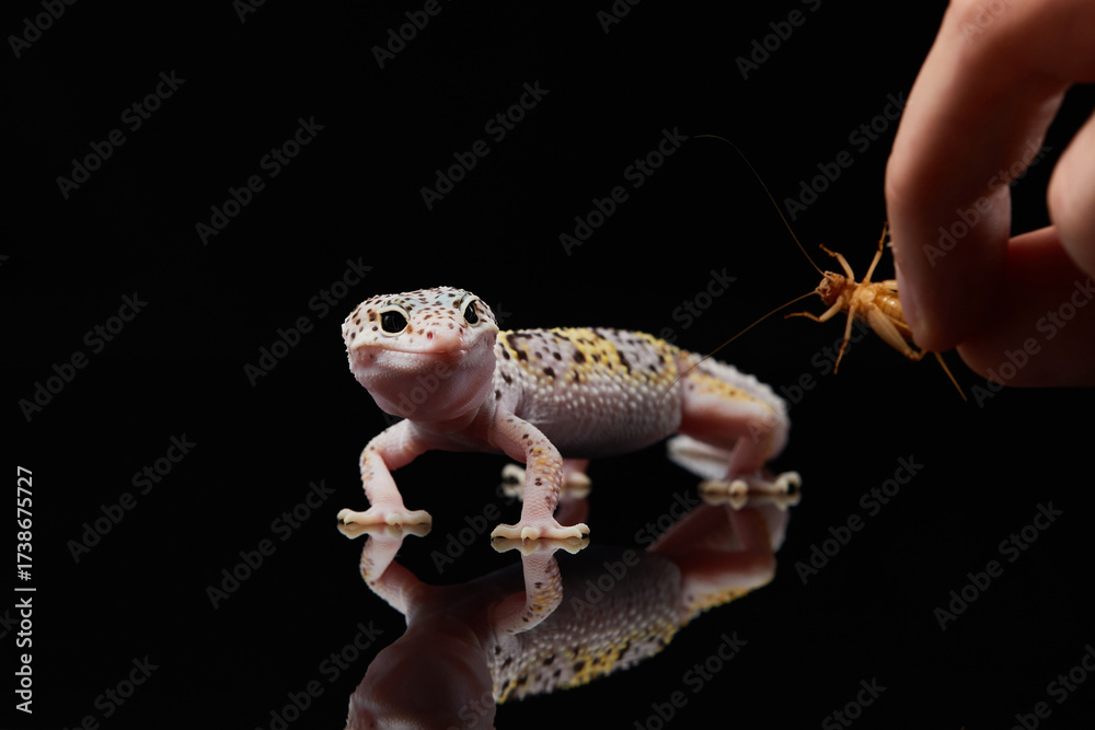 A leopard gecko is standing on a black reflective surface, with its colorful skin visible.