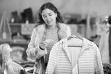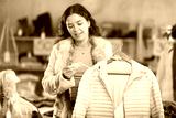 Fashionista girl near showcase examine goods, buying down coat. Off line clothing store from retailer. Style and fashion type look, modern trends. Outlet, discount store