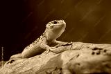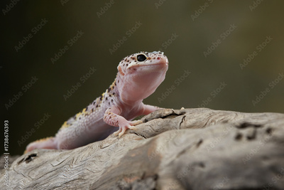 A leopard gecko is exploring a log, its vibrant colors standing out against the rough wood