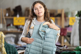 Fashionista girl near showcase examine goods, buying waistcoat. Off line clothing store from retailer. Style and fashion type look, modern trends. Outlet, discount store