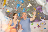 Trainer giving instructions to man on wall climbing at bouldering gym
