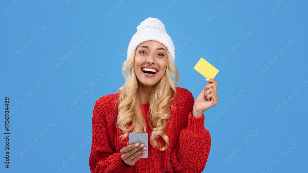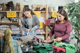 Latina woman carefully selects a warm sweater, pullover or cardigan in a clothing store.
