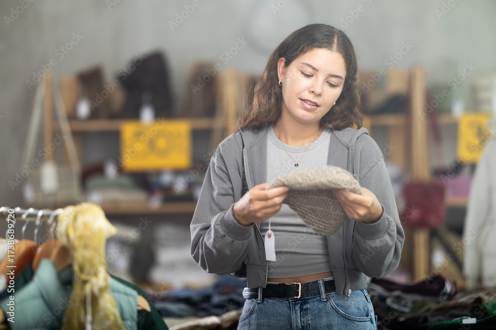 Young woman customer examine and choose warm hat in store, and buyer consider some items. Concept of seasonal wardrobe shopping. Client enjoys shopping for stylish clothes