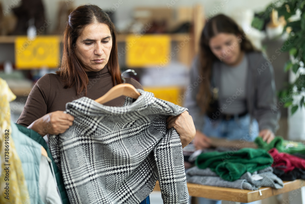 Female shopper chooses beautiful checkered coat-jacket in a clothing store