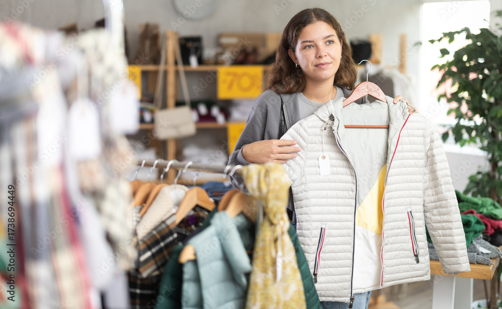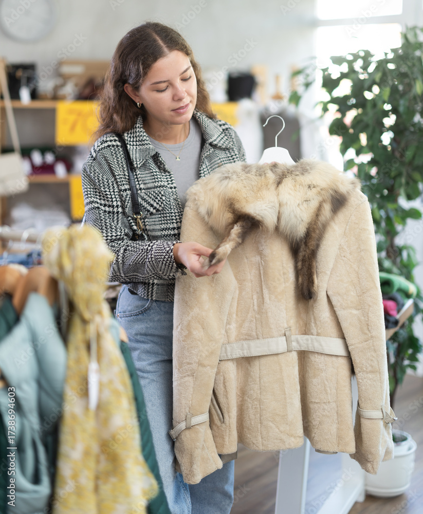 Young woman customer examine and choose fur coat in store, and buyer consider some items. Concept of seasonal wardrobe shopping. Client enjoys shopping for stylish clothes.