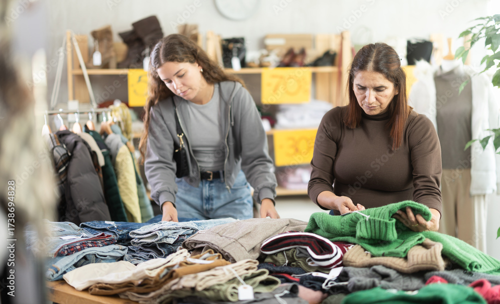 During November sales, Latin woman choose and buy buy something autumn clothes. Discount season, promotional offers. Chain store of affordable clothing. Buyer browsing clothes goods in background