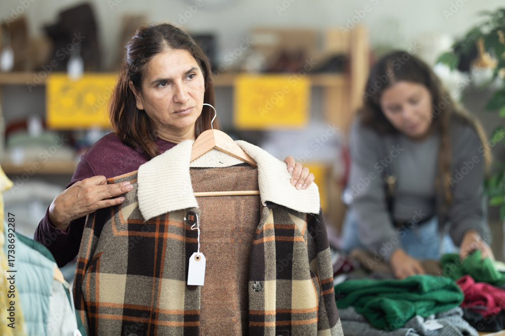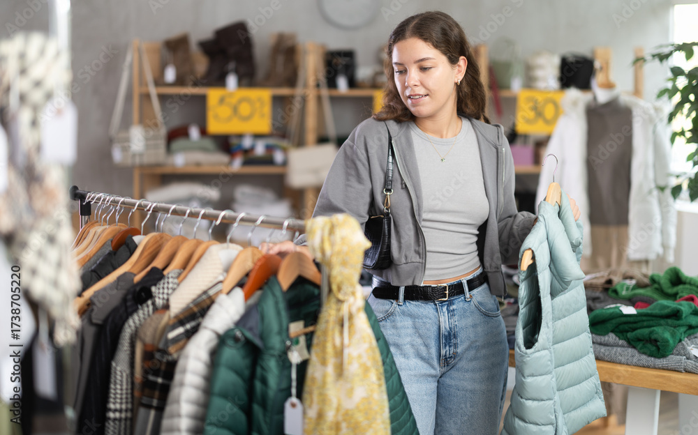 During November sales, young woman choose and buy something autumn outwear, choose some wardrobe items. Discount season, promotional offers. Chain store of affordable clothing
