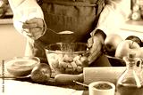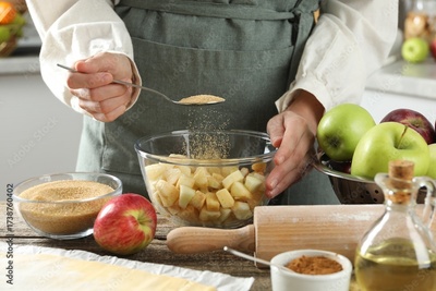 Making delicious apple strudel. Woman adding brown sugar into bowl with pieces of fruit at wooden table in kitchen, closeup