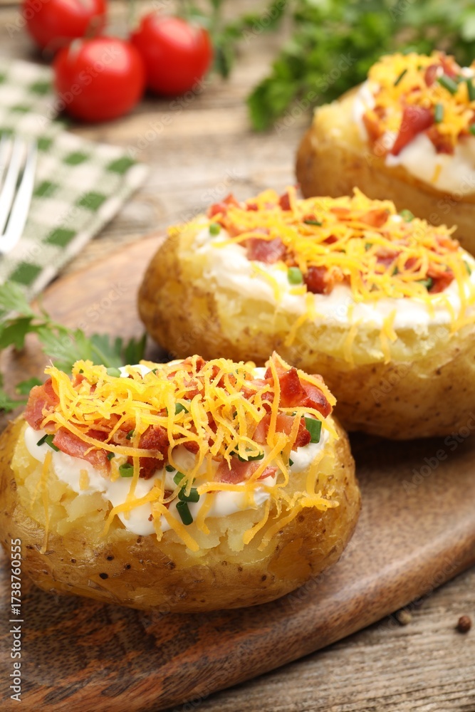 Tasty baked potatoes with sour cream, green onion, cheese and bacon on wooden table, closeup