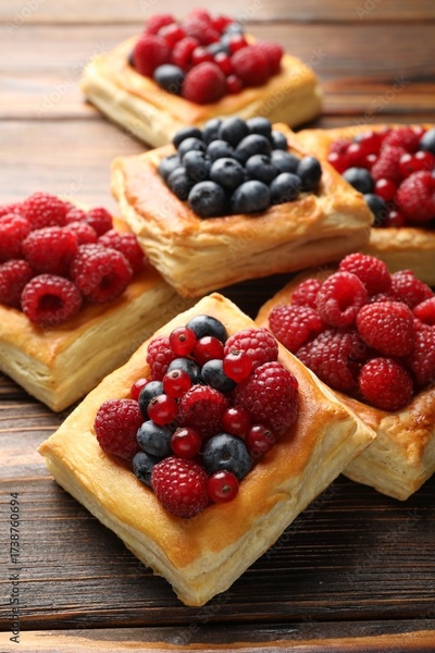 Tasty puff pastries with berries on wooden table, closeup