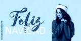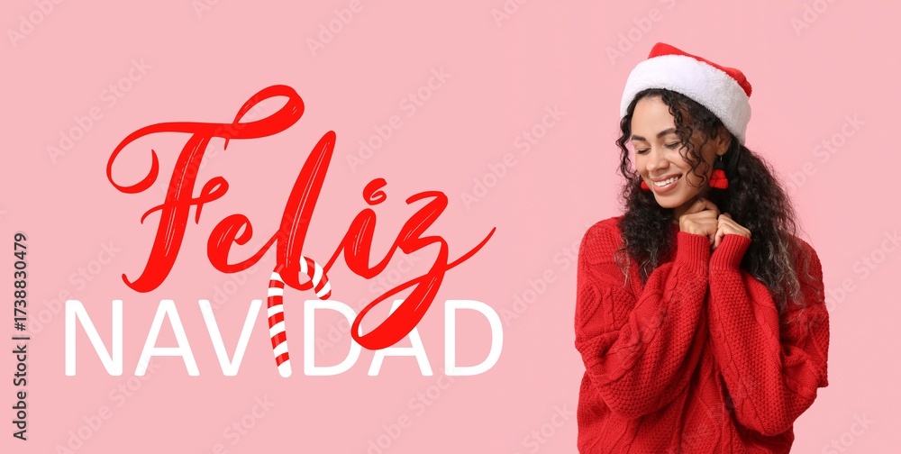 Young African-American woman in Santa hat and text FELIZ NAVIDAD (Spanish for Merry Christmas) on pink background