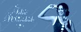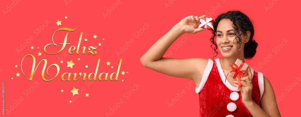 Young African-American woman in Santa Claus costume, with gift and text FELIZ NAVIDAD (Spanish for Merry Christmas) on red background