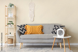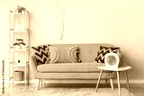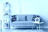 Electric fan heater on coffee table near sofa and shelving unit in living room