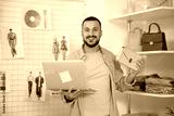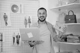Happy male stylist with laptop video chatting in studio