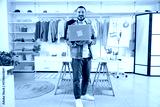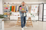 Happy male stylist with laptop working in studio