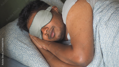 Man sleeping peacefully with a sleep mask at home