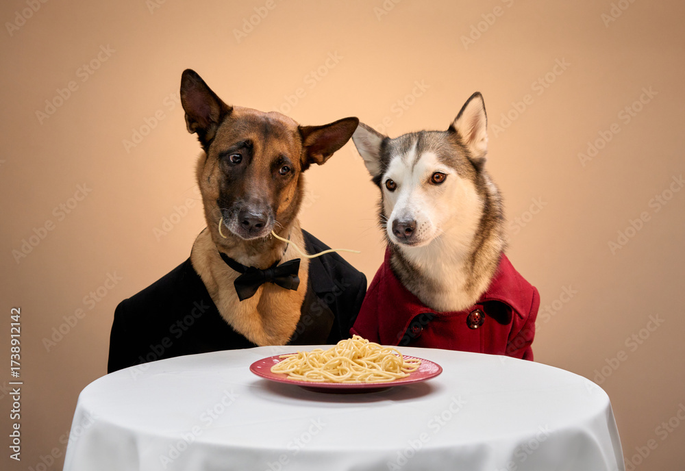 A Belgian Malinois and a Siberian Husky in formal clothing are seated at a dining table with food, showcasing their elegance. Their coordinated outfits and attentive poses create a refined look.