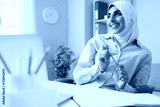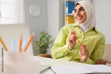 Dreaming Muslim businesswoman at table in office