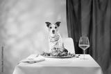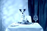 A Jack Russell Terrier sits attentively at a table with a gourmet plate of raw meat and a glass of wine. The sophisticated indoor setup highlights the dog composed and poised demeanor.