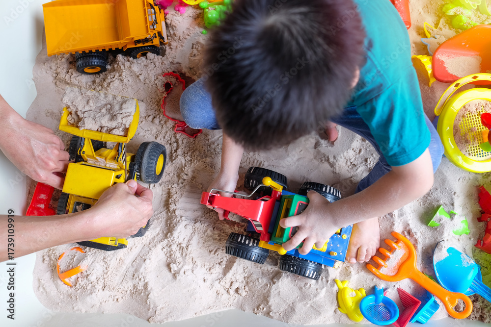 Top view child playing with toy construction trucks in sand, Montessori activity for kids, concept of creativity, sensory play, learning development, imagination, fun childhood, motor skills practice