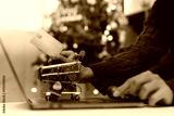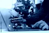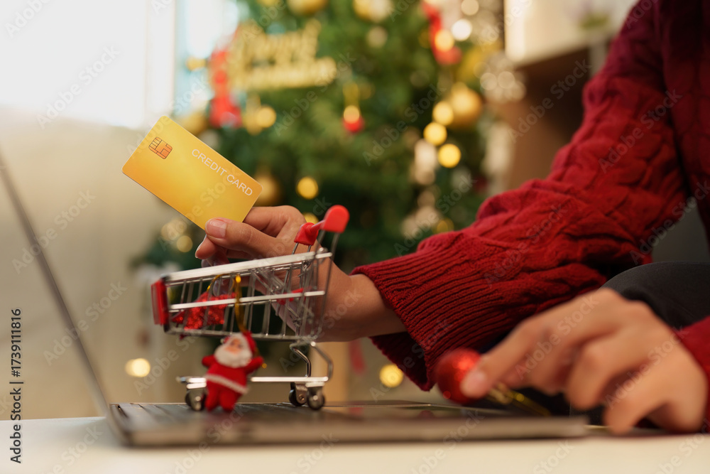 Christmas shopping. Woman using credit card while shopping online with laptop.