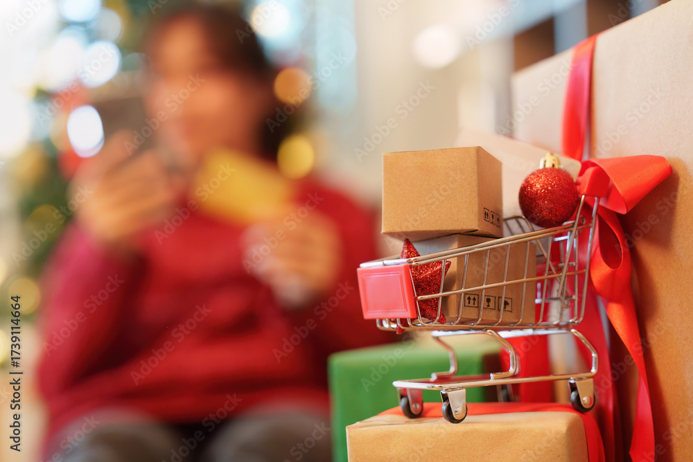 Christmas shopping cart. Mini cart with packages and smartphone in background.