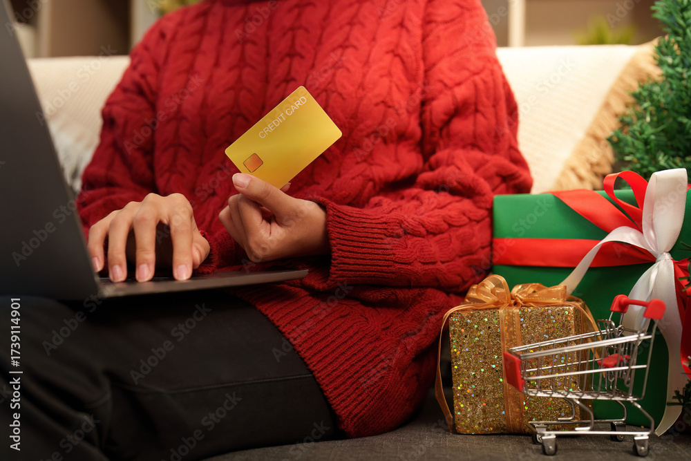Shopping for Christmas. Online shopping with credit card and gifts.