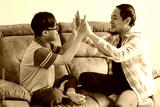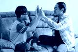 Father and Son Celebrating Success with High-five Gesture on Comfortable Sofa at Home