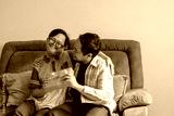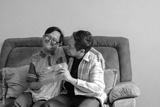 Happy Father's Day. Son with Down Syndrome Giving Gift Box to His Dad on Sofa at Home