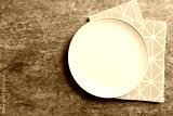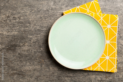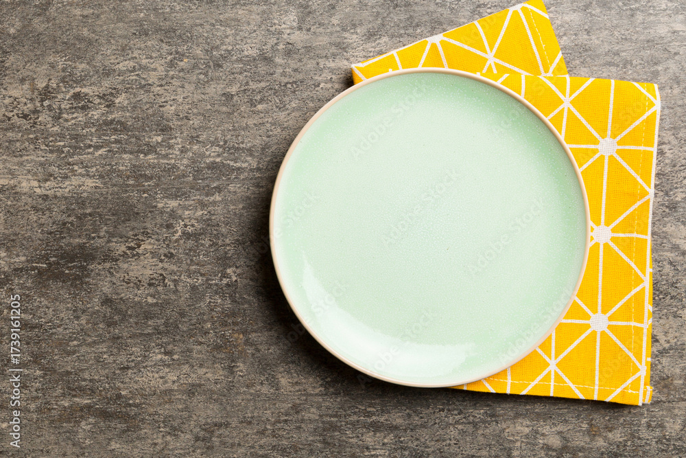 Top view on colored background empty round green plate on tablecloth for food. Empty dish on napkin with space for your design