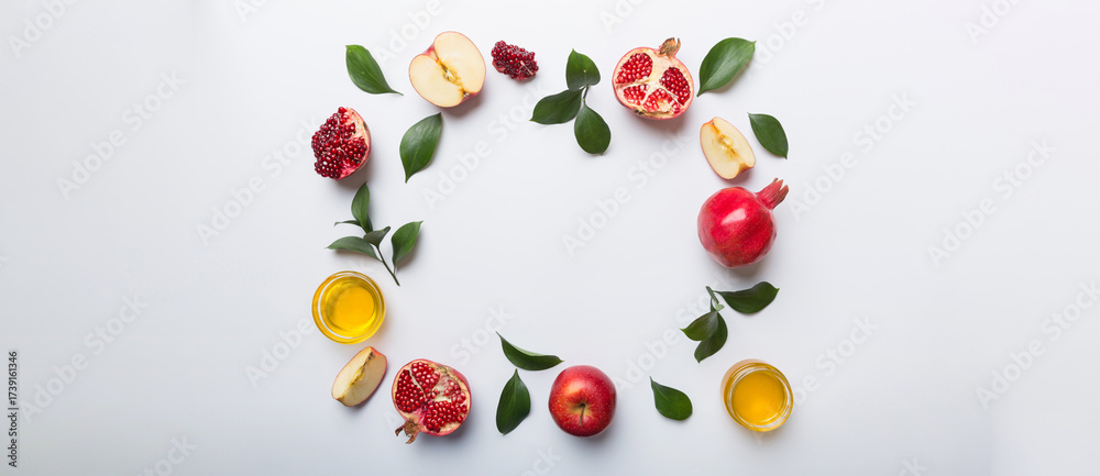 Rosh hashanah concept. Frame made of symbols jewish New Year holiday Traditional. Top view with copy space