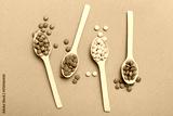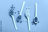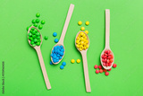 delicious colorful sweet candies on spoon on colored background . Confectionery decor top view with copy space