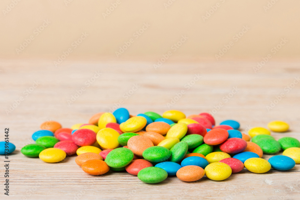 Pile of delicious colorful sweet candies on colored background top view. Confectionery decor