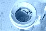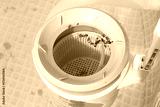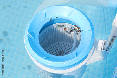 Top view of the blue skimmer for cleaning the pool in clear water. Contaminated pool cleaning concept