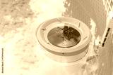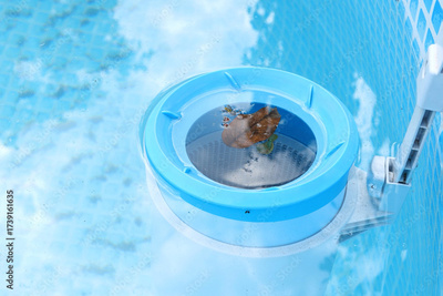 Top view of the blue skimmer for cleaning the pool in clear water. Contaminated pool cleaning concept