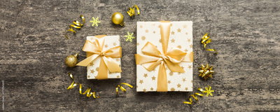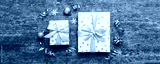 Top view Flat lay Christmas decorations and gift box on colored background with copy space. Christmas or Happy New Year composition